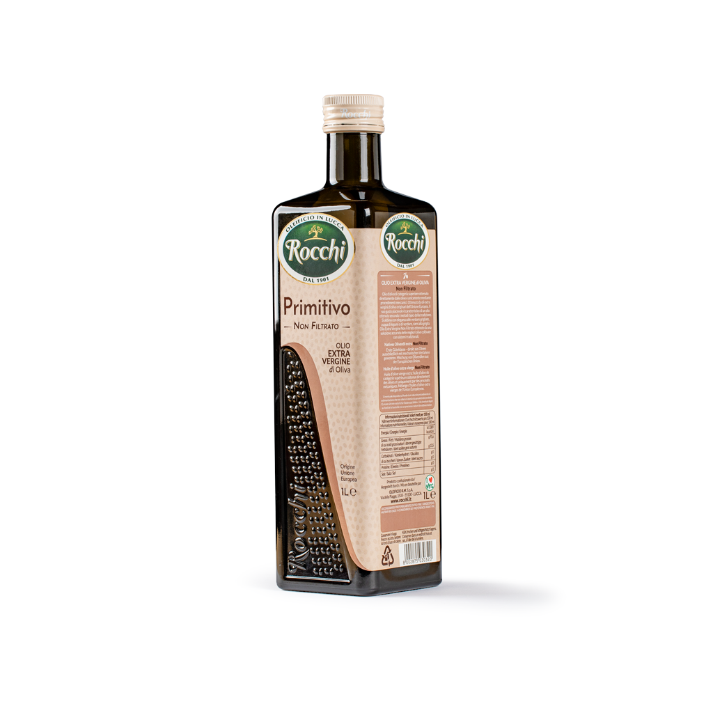 Olio Rocchi Primitivo è un Olio Extra Vergine di Oliva Non Filtrato ottenuto da una selezione accurata di olive europee coltivate con sistemi tradizionali. Sapore genuino e deciso, rivela tutta la naturalezza delle olive appena raccolte.